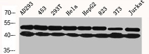 Western Blot analysis of AD293 453 293T HELA HepG2 823 NIH-3T3 Jurkat cells using ERK 1/2 Polyclonal Antibody