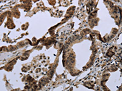 The image on the left is immunohistochemistry of paraffin-embedded Human colon cancer tissue using CSB-PA557048(MAPKAPK2 Antibody) at dilution 1/20, on the right is treated with synthetic peptide. (Original magnification: ×200)