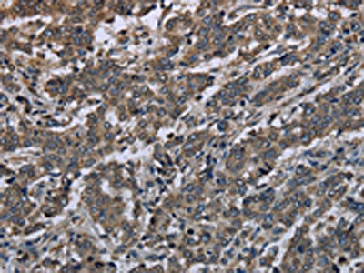 The image on the left is immunohistochemistry of paraffin-embedded Human liver cancer tissue using CSB-PA557048(MAPKAPK2 Antibody) at dilution 1/20, on the right is treated with synthetic peptide. (Original magnification: ×200)