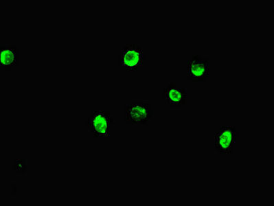 Immunofluorescent analysis of Hela cells using CSB-PA013527LA01HU at dilution of 1:100 and Alexa Fluor 488-congugated AffiniPure Goat Anti-Rabbit IgG(H+L)