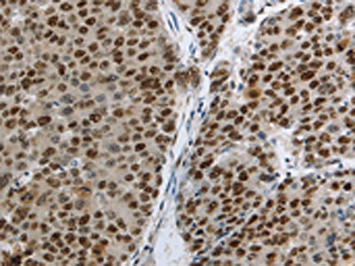 The image on the left is immunohistochemistry of paraffin-embedded Human liver cancer tissue using CSB-PA969629(MCM3 Antibody) at dilution 1/30, on the right is treated with fusion protein. (Original magnification: ×200)