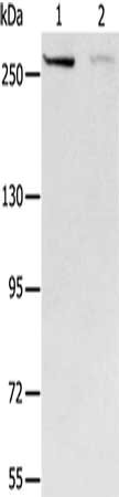 Gel: 6%SDS-PAGE, Lysate: 40 μg, Lane 1-2: Hela cells, 293T cells, Primary antibody: CSB-PA290508(MCM3AP Antibody) at dilution 1/250, Secondary antibody: Goat anti rabbit IgG at 1/8000 dilution, Exposure time: 20 seconds