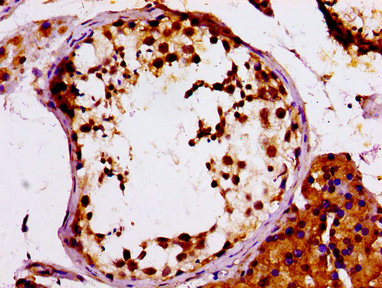 IHC image of CSB-PA013594LA01HU diluted at 1:100 and staining in paraffin-embedded human testis tissue performed on a Leica BondTM system. After dewaxing and hydration, antigen retrieval was mediated by high pressure in a citrate buffer (pH 6.0). Section was blocked with 10% normal goat serum 30min at RT. Then primary antibody (1% BSA) was incubated at 4°C overnight. The primary is detected by a biotinylated secondary antibody and visualized using an HRP conjugated SP system.