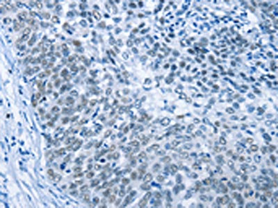 The image on the left is immunohistochemistry of paraffin-embedded Human cervical cancer tissue using CSB-PA135119(MCM7 Antibody) at dilution 1/40, on the right is treated with fusion protein. (Original magnification: ×200)