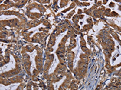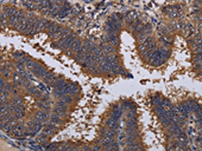 The image on the left is immunohistochemistry of paraffin-embedded Human colon cancer tissue using CSB-PA972492(MCTS1 Antibody) at dilution 1/30, on the right is treated with fusion protein. (Original magnification: ×200)