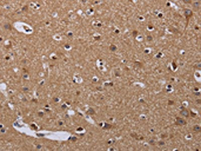 The image on the left is immunohistochemistry of paraffin-embedded Human brain tissue using CSB-PA200543(MCTS1 Antibody) at dilution 1/60, on the right is treated with fusion protein. (Original magnification: ×200)