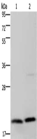 Gel: 10%SDS-PAGE, Lysate: 40 μg, Lane 1-2: Jurkat cells, PC3 cells, Primary antibody: CSB-PA200543(MCTS1 Antibody) at dilution 1/200, Secondary antibody: Goat anti rabbit IgG at 1/8000 dilution, Exposure time: 1 minute