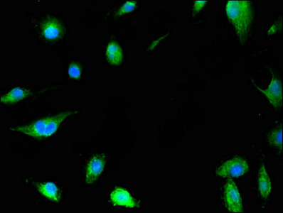 Immunofluorescent analysis of U251 cells using CSB-PA013714LA01HU at dilution of 1:100 and Alexa Fluor 488-congugated AffiniPure Goat Anti-Rabbit IgG(H+L)
