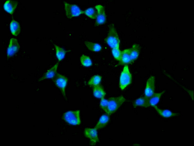Immunofluorescence staining of SH-SY5Y cells with CSB-PA751152LA01HU at 1:100, counter-stained with DAPI. The cells were fixed in 4% formaldehyde, permeabilized using 0.2% Triton X-100 and blocked in 10% normal Goat Serum. The cells were then incubated with the antibody overnight at 4°C. The secondary antibody was Alexa Fluor 488-congugated AffiniPure Goat Anti-Rabbit IgG(H+L).
