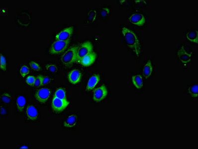 Immunofluorescent analysis of A549 cells using CSB-PA013748LA01HU at dilution of 1:100 and Alexa Fluor 488-congugated AffiniPure Goat Anti-Rabbit IgG(H+L)