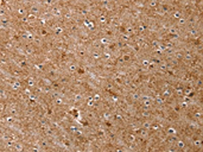 The image on the left is immunohistochemistry of paraffin-embedded Human brain tissue using CSB-PA218758(MGST1 Antibody) at dilution 1/35, on the right is treated with synthetic peptide. (Original magnification: ×200)