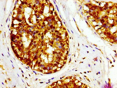 IHC image of CSB-PA06867A0Rb diluted at 1:400 and staining in paraffin-embedded human breast cancer performed on a Leica BondTM system. After dewaxing and hydration, antigen retrieval was mediated by high pressure in a citrate buffer (pH 6.0). Section was blocked with 10% normal goat serum 30min at RT. Then primary antibody (1% BSA) was incubated at 4°C overnight. The primary is detected by a biotinylated secondary antibody and visualized using an HRP conjugated SP system.