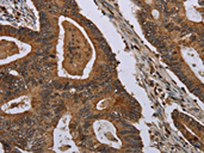 The image on the left is immunohistochemistry of paraffin-embedded Human colon cancer tissue using CSB-PA799324(MIG7 Antibody) at dilution 1/35, on the right is treated with synthetic peptide. (Original magnification: ×200)