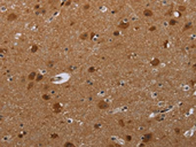 The image on the left is immunohistochemistry of paraffin-embedded Human brain tissue using CSB-PA597310(MIG7 Antibody) at dilution 1/20, on the right is treated with synthetic peptide. (Original magnification: ×200)