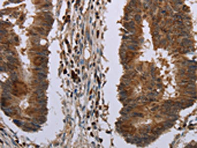 The image on the left is immunohistochemistry of paraffin-embedded Human colon cancer tissue using CSB-PA597310(MIG7 Antibody) at dilution 1/20, on the right is treated with synthetic peptide. (Original magnification: ×200)