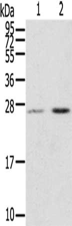 Gel: 12%SDS-PAGE, Lysate: 40 μg, Lane 1-2: Human placenta tissue, Human breast infiltrative duct tissue, Primary antibody: CSB-PA597310(MIG7 Antibody) at dilution 1/200, Secondary antibody: Goat anti rabbit IgG at 1/8000 dilution, Exposure time: 15 seconds