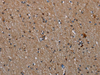 The image on the left is immunohistochemistry of paraffin-embedded Human brain tissue using CSB-PA185762(MMP23B Antibody) at dilution 1/20, on the right is treated with synthetic peptide. (Original magnification: ×200)