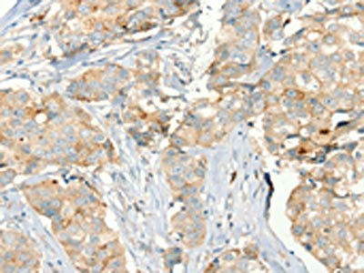 The image on the left is immunohistochemistry of paraffin-embedded Human breast cancer tissue using CSB-PA255651(MMP9 Antibody) at dilution 1/20, on the right is treated with fusion protein. (Original magnification: ×200)