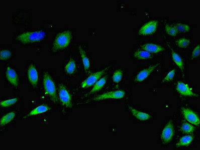 Immunofluorescent analysis of Hela cells using CSB-PA014706ESR2HU at dilution of 1:100 and Alexa Fluor 488-congugated AffiniPure Goat Anti-Rabbit IgG(H+L)