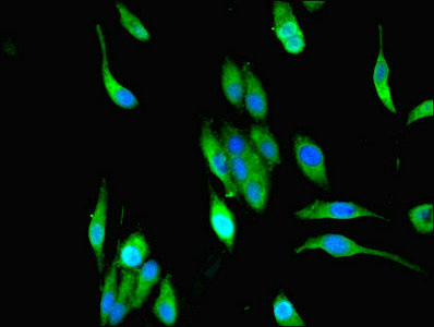 Immunofluorescent analysis of Hela cells using CSB-PA014767LA01HU at dilution of 1:100 and Alexa Fluor 488-congugated AffiniPure Goat Anti-Rabbit IgG(H+L)