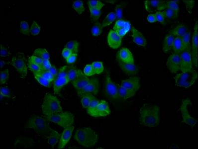 Immunofluorescence staining of MCF-7 cells with CSB-PA740916LA01HU at 1:66, counter-stained with DAPI. The cells were fixed in 4% formaldehyde, permeabilized using 0.2% Triton X-100 and blocked in 10% normal Goat Serum. The cells were then incubated with the antibody overnight at 4°C. The secondary antibody was Alexa Fluor 488-congugated AffiniPure Goat Anti-Rabbit IgG(H+L).