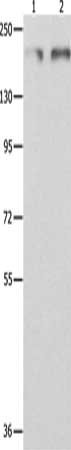 Gel: 8%SDS-PAGE, Lysate: 40 μg, Lane 1-2: Hela cells, 293T cells, Primary antibody: CSB-PA051370(MSH6 Antibody) at dilution 1/300, Secondary antibody: Goat anti rabbit IgG at 1/8000 dilution, Exposure time: 45 seconds