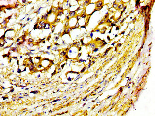 IHC image of CSB-PA015055LA01HU diluted at 1:400 and staining in paraffin-embedded human gastric cancer performed on a Leica BondTM system. After dewaxing and hydration, antigen retrieval was mediated by high pressure in a citrate buffer (pH 6.0). Section was blocked with 10% normal goat serum 30min at RT. Then primary antibody (1% BSA) was incubated at 4°C overnight. The primary is detected by a biotinylated secondary antibody and visualized using an HRP conjugated SP system.
