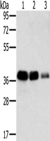 Gel: 8%SDS-PAGE, Lysate: 40 μg, Lane 1-3: A549 cells, HT29 cells, A172 cells, Primary antibody: CSB-PA782082(MTFR1 Antibody) at dilution 1/500, Secondary antibody: Goat anti rabbit IgG at 1/8000 dilution, Exposure time: 5 seconds