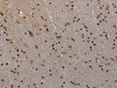 The image on the left is immunohistochemistry of paraffin-embedded Human brain tissue using CSB-PA098234(MTSS1 Antibody) at dilution 1/20, on the right is treated with synthetic peptide. (Original magnification: ×200)