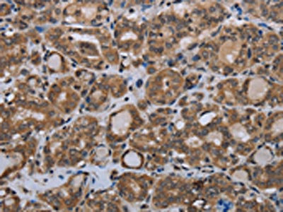 The image on the left is immunohistochemistry of paraffin-embedded Human thyroid cancer tissue using CSB-PA098234(MTSS1 Antibody) at dilution 1/20, on the right is treated with synthetic peptide. (Original magnification: ×200)