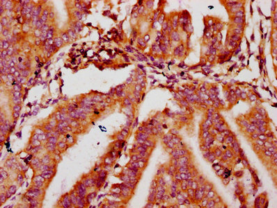 IHC image of CSB-PA015201LA01HU diluted at 1:400 and staining in paraffin-embedded human endometrial cancer performed on a Leica BondTM system. After dewaxing and hydration, antigen retrieval was mediated by high pressure in a citrate buffer (pH 6.0). Section was blocked with 10% normal goat serum 30min at RT. Then primary antibody (1% BSA) was incubated at 4°C overnight. The primary is detected by a biotinylated secondary antibody and visualized using an HRP conjugated SP system.