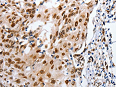 The image on the left is immunohistochemistry of paraffin-embedded Human cervical cancer tissue using CSB-PA029874(MUTYH Antibody) at dilution 1/25, on the right is treated with fusion protein. (Original magnification: ×200)