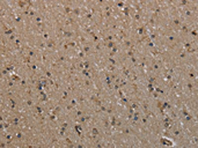 The image on the left is immunohistochemistry of paraffin-embedded Human brain tissue using CSB-PA142898(MYO18B Antibody) at dilution 1/20, on the right is treated with synthetic peptide. (Original magnification: ×200)