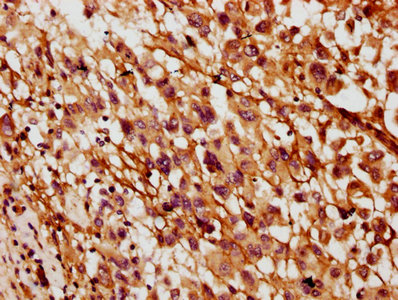IHC image of CSB-PA848841LA01HU diluted at 1:400 and staining in paraffin-embedded human melanoma performed on a Leica BondTM system. After dewaxing and hydration, antigen retrieval was mediated by high pressure in a citrate buffer (pH 6.0). Section was blocked with 10% normal goat serum 30min at RT. Then primary antibody (1% BSA) was incubated at 4°C overnight. The primary is detected by a biotinylated secondary antibody and visualized using an HRP conjugated SP system.
