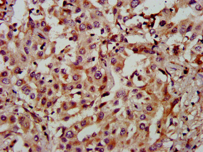IHC image of CSB-PA875691LA01HU diluted at 1:900 and staining in paraffin-embedded human liver cancer performed on a Leica BondTM system. After dewaxing and hydration, antigen retrieval was mediated by high pressure in a citrate buffer (pH 6.0). Section was blocked with 10% normal goat serum 30min at RT. Then primary antibody (1% BSA) was incubated at 4°C overnight. The primary is detected by a biotinylated secondary antibody and visualized using an HRP conjugated SP system.
