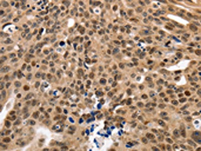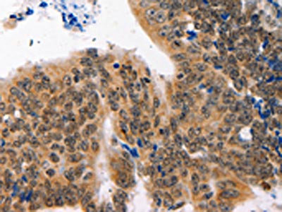 The image on the left is immunohistochemistry of paraffin-embedded Human ovarian cancer tissue using CSB-PA089095(NAIF1 Antibody) at dilution 1/60, on the right is treated with fusion protein. (Original magnification: ×200)
