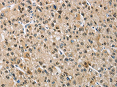 The image on the left is immunohistochemistry of paraffin-embedded Human liver cancer tissue using CSB-PA252963(NAPSA Antibody) at dilution 1/50, on the right is treated with fusion protein. (Original magnification: ×200)