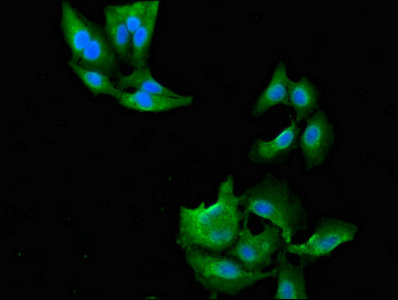 Immunofluorescent analysis of Hela cells using CSB-PA015464LA01HU at dilution of 1:100 and Alexa Fluor 488-congugated AffiniPure Goat Anti-Rabbit IgG(H+L)