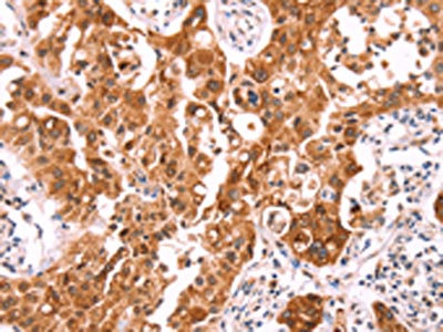 The image on the left is immunohistochemistry of paraffin-embedded Human lung cancer tissue using CSB-PA109556(NCEH1 Antibody) at dilution 1/80, on the right is treated with fusion protein. (Original magnification: ×200)