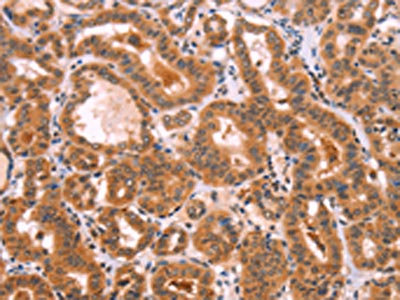 The image on the left is immunohistochemistry of paraffin-embedded Human thyroid cancer tissue using CSB-PA063661(NCEH1 Antibody) at dilution 1/80, on the right is treated with fusion protein. (Original magnification: ×200)