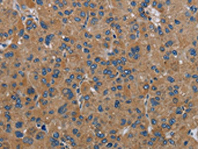 The image on the left is immunohistochemistry of paraffin-embedded Human liver cancer tissue using CSB-PA205015(NDUFA9 Antibody) at dilution 1/30, on the right is treated with fusion protein. (Original magnification: ×200)