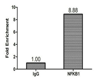 Chromatin Immunoprecipitation Hela (1.1*106) were cross-linked with formaldehyde, sonicated, and immunoprecipitated with 4µg anti-NFKB1 or a control normal rabbit IgG. The resulting ChIP DNA was quantified using real-time PCR with primers (CSB-PP10354HU) against the IkB promoter.