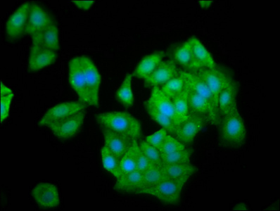 Immunofluorescence staining of HepG2 cells with CSB-PA863161LA01HU at 1:100, counter-stained with DAPI. The cells were fixed in 4% formaldehyde, permeabilized using 0.2% Triton X-100 and blocked in 10% normal Goat Serum. The cells were then incubated with the antibody overnight at 4°C. The secondary antibody was Alexa Fluor 488-congugated AffiniPure Goat Anti-Rabbit IgG(H+L).
