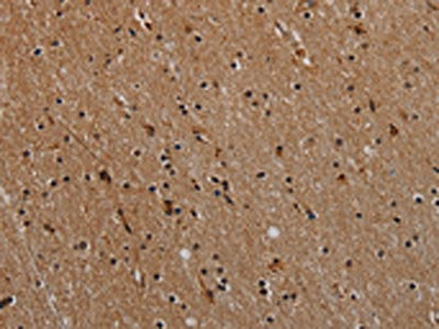 The image on the left is immunohistochemistry of paraffin-embedded Human brain tissue using CSB-PA447017(NLRP9 Antibody) at dilution 1/40, on the right is treated with synthetic peptide. (Original magnification: ×200)