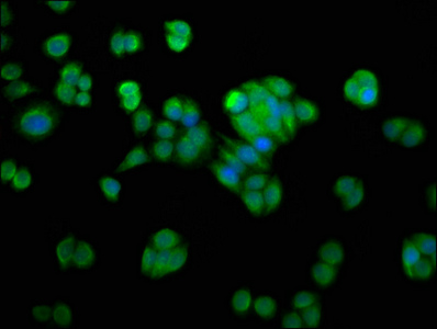 Immunofluorescence staining of PC-3 cells with CSB-PA867194LA01HU at 1:200, counter-stained with DAPI. The cells were fixed in 4% formaldehyde, permeabilized using 0.2% Triton X-100 and blocked in 10% normal Goat Serum. The cells were then incubated with the antibody overnight at 4°C. The secondary antibody was Alexa Fluor 488-congugated AffiniPure Goat Anti-Rabbit IgG(H+L).