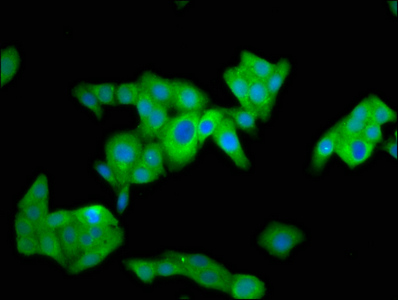 Immunofluorescence staining of HepG2 cells with CSB-PA897595LA01HU at 1:100, counter-stained with DAPI. The cells were fixed in 4% formaldehyde, permeabilized using 0.2% Triton X-100 and blocked in 10% normal Goat Serum. The cells were then incubated with the antibody overnight at 4°C. The secondary antibody was Alexa Fluor 488-congugated AffiniPure Goat Anti-Rabbit IgG(H+L).