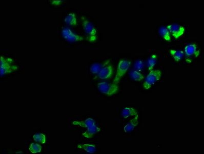 Immunofluorescence staining of HepG2 cells with CSB-PA016359OA01HU at 1:50, counter-stained with DAPI. The cells were fixed in 4% formaldehyde, permeabilized using 0.2% Triton X-100 and blocked in 10% normal Goat Serum. The cells were then incubated with the antibody overnight at 4°C. The secondary antibody was Alexa Fluor 488-congugated AffiniPure Goat Anti-Rabbit IgG(H+L).