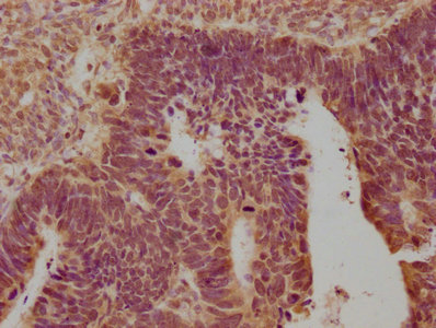 IHC image of CSB-PA016359OA01HU diluted at 1:100 and staining in paraffin-embedded human ovarian cancer performed on a Leica BondTM system. After dewaxing and hydration, antigen retrieval was mediated by high pressure in a citrate buffer (pH 6.0). Section was blocked with 10% normal goat serum 30min at RT. Then primary antibody (1% BSA) was incubated at 4°C overnight. The primary is detected by a biotinylated secondary antibody and visualized using an HRP conjugated SP system.