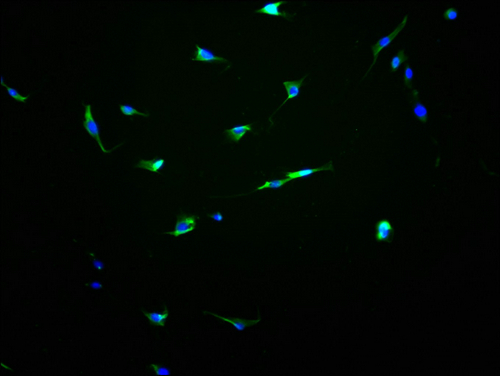 Immunofluorescence staining of NIH/3T3 cells with CSB-PA854143OA01HU at 1:100, counter-stained with DAPI. The cells were fixed in 4% formaldehyde and blocked in 10% normal Goat Serum. The cells were then incubated with the antibody overnight at 4°C. The secondary antibody was Alexa Fluor 488-congugated AffiniPure Goat Anti-Rabbit IgG(H+L).