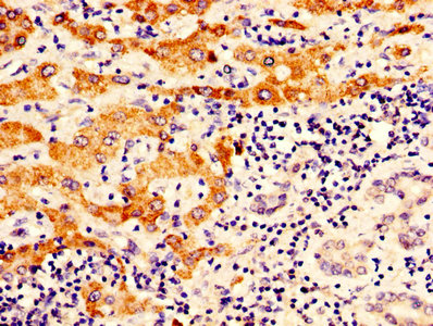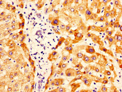 IHC image of CSB-PA017270LA01HU diluted at 1:400 and staining in paraffin-embedded human liver tissue performed on a Leica BondTM system. After dewaxing and hydration, antigen retrieval was mediated by high pressure in a citrate buffer (pH 6.0). Section was blocked with 10% normal goat serum 30min at RT. Then primary antibody (1% BSA) was incubated at 4°C overnight. The primary is detected by a biotinylated secondary antibody and visualized using an HRP conjugated SP system.